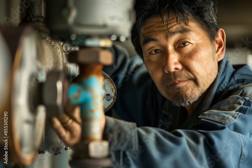 plumber, plumbing, water, meter, pipe, man, working, job, occupation, repair, fix, fixing, technician, service, industry, professional, industrial, maintenance, engineer, system, pressure, gauge, valva, equipment, wrench, tool, construction, men at work, blue-collar, uniform, adult, portrait, closeup, confidence, expertise, skilled, labor, problem solving, mechanical, house, home, domestic, water supply, flow