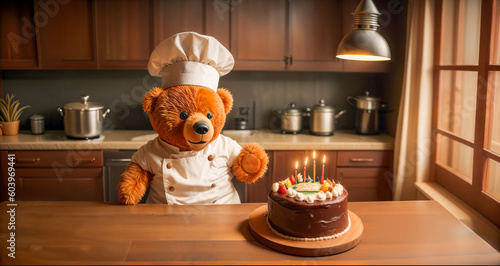 teddy bear, kitchen, baking, cake, cooking, apron, dessert, chef, hat, oven, delicious, deliciously, receipe, cupcake, frosting, decoration, chocolate, happy, joyful, adorable, cute, fun, playful, childlike, toy, celebration, candle, animal, brown, nubes, childhood, fur, children, bear, teddy, generative, generated, ai, baby, children