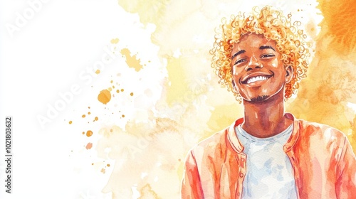 teenage, black, man, blond, curly, hair, portrait, face, person, human, character, profile, head, model, skin, individuality, identity, male, guy, gentleman, teenage, teenage, youth, puberty, african, african american, smiling, casual attire, placeholder, copy space, modern, trendy, advertising, watercolor, painting, blob, stain, paint, clothing, outfit, white, horizontal, illustration, design, decorative, creative, colours, poster, generative, ai