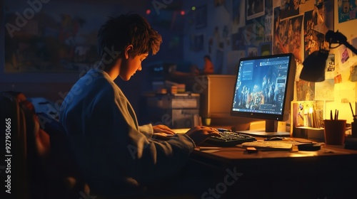 Teen Boy in His Bedroom on Computer at Night. 8k Realistic