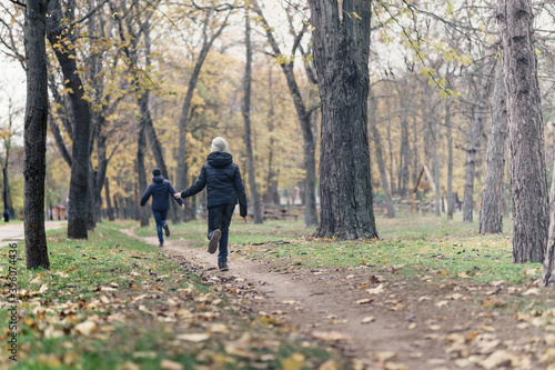 teen girl and boy running through the park and enjoys autumn, beautiful nature with yellow leaves