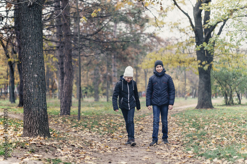 teen girl and boy walking through the park and enjoys autumn, beautiful nature with yellow leaves