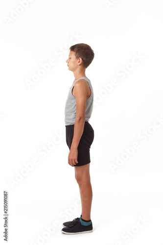 Teen in a T-shirt and shorts performs gymnastic exercises.
