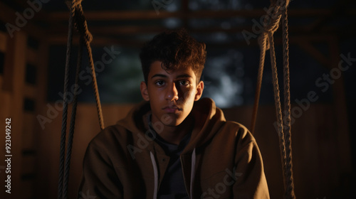 swing, worried, sitting, concerned, youth, expression, anxious, pensive, solitude, teenage, middle eastern, emotion, thoughtful, introspection, mood, contemplation, adolescence, playground, young person, alone, portrait, mental health, troubled, childhood