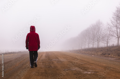 teenage, walking, dirt road, mist, farm, red, boy, cloud, destination, jacket, mountain, photo, tree, rear, rural, visit