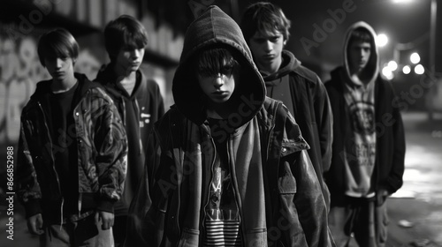 teenage boy, hoodie, friends, night, street, urban, group, black-and-white, monochrome, youth, dark, shadow, portrait, friendship, casual attire, standing, young, guy, moody, atmosphere, teenage, city, boy, cool, night time, youth culture, street scene, young people, city landscape, gloomy