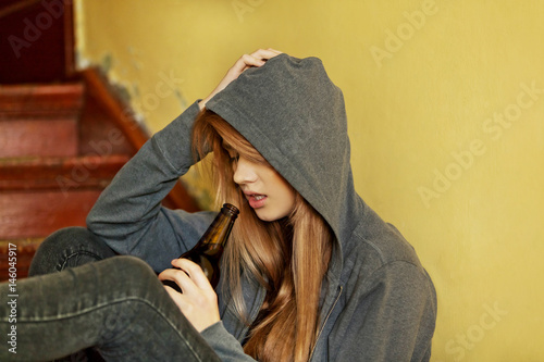 Teenage depressed woman sitting on the staircase and drinking a beer