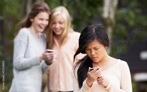 mobile, mobile phone, mobile phone, text messaging, text message, unhappy, threatening, casual clothes, mobile phone, texting, bullying, pretty, sad, worried, social issue, problem, horizontal, harassment, threat, cruel, victim, outdoors, laughing, girl, teenage, teenage, teenage, asian, female, person, people, caucasian, three people