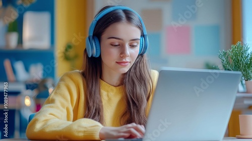 student, girl, young, woman, sharpened, learning, technology, laptop, study, concentrated, listening, music, earphones, yellow, sweater, online, education, work, home