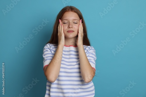Teenage girl meditating on light blue background. Way to stop panic attack