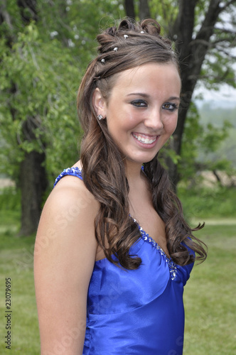 teenage, teenage, girl, young, female, prom, gown, dress, formal, blue, long, brown, hair, style, stylish, styled, outdoors, smiling, pretty, fancy, school, senior, spring, strapless, beautiful, tan, portrait, dressy, fashion, fashionable