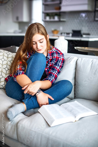 Teenage girl sitting on a couch at home reading the Bible and praying; Edmonton, Alberta, Canada