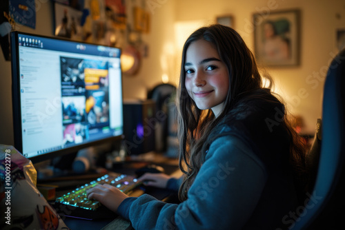 Teenage Girl Smiling While Gaming on a Desktop Computer, Smiling teenage girl enjoying a gaming session on her desktop computer in a cozy room, illuminated by warm lighting and a colorful keyboard.