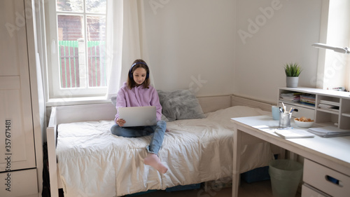 Teenage girl wear wireless earphones sit on bed at home watch video or movie on modern laptop, teenager in headphones relax in cozy bedroom using computer, chat or message with friends online