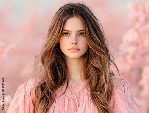 girl, teenage, portrait, beauty, hair, long, wavy, pink, dress, fashion, make-up, face, eye, pretty, natural, charming, soft, image, calm, attractive, beautiful, casual attire, style, young, woman, modern, hair care, glamour, elegant, photo, photo, spring, blossom, outdoors, tree, floral, nature, colours, texture, light, shadow, closeup, detail, model, photogenic