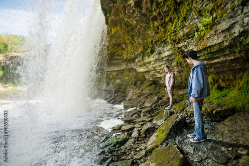 Teenage girls admiring Jagala Waterfall or Jagala juga, the widest natural waterfall in Estonia, located on the Jagala River near the Gulf of Finland. Koogi, Harju County.