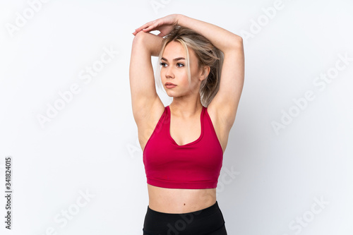girl, woman, woman, people, person, female, studio, teenage, teenage, youth, young, background, isolated, blue, epicure, cream, strawberry, baked, bakery, wafer, pastry, sweet, waffle, food, dessert, breakfast, stretching, stretch, up, active, flexibility, warm, arm, arm, shoulder, back