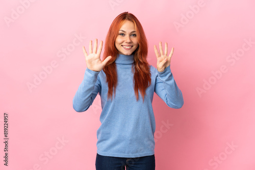 Teenager Russian girl isolated on pink background counting nine with fingers