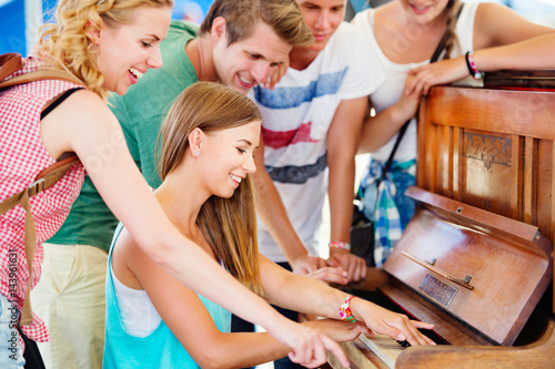 Teenagers at summer music festival, girl plays the piano