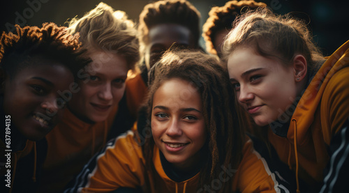 Teenagers from diverse backgrounds coming together in a huddle, showcasing unity - Diversity and unity - AI Generated
