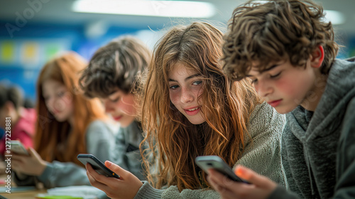 Teenagers interact with their smartphones while in a classroom environment, reflecting modern learning and connectivity trends. The atmosphere conveys focus, collaboration
