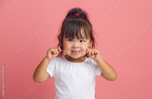 girl, little, use, dental, floss, teeth, flossing, care, three, year, old, asian, portrait, isolated, pink, background, ethnicity, korean, chinese, japanese, children, children, routine, health, t-shirt, white, clean, copy space, free, copy, space, empty