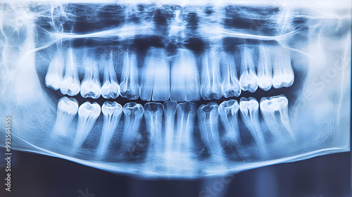 teeth inside the mouth, showcasing the growth of a wisdom tooth. Detailed anatomy for dental .detailed X-ray scan, highlighting the anatomy of teeth and the growth of a wisdom tooth. Focus on root.