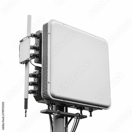 Telecommunication pole of 4G and 5G cellular. Base Station or Base Transceiver Station. Wireless Communication Antenna Transmitter. Telecommunication pole with antennas isolated on white background.