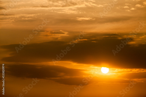 Telephoto photo of yellow orange sunset sunrise, clouds, sky golden hour. golden