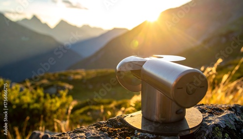 telescope, mountain, sunset, sunlight, gold, landscape, nature, rock, view, scenic, peak, observation, vantage, horizon, sky, outdoors, travel, expedition, journey, exploration, tour tourism, adventure, climbing, hiking, panorama, dawn, evening, field, grass, plant, wilderness, environment, earth, global, top, perspective, sharpened, clarity, lens, metal, silver, angle, composition, beauty, peace, calm, serene, wild