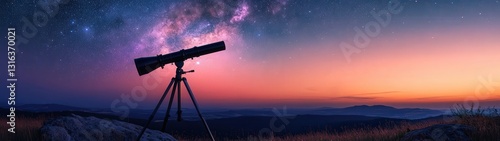Telescope under starry night sky landscape.