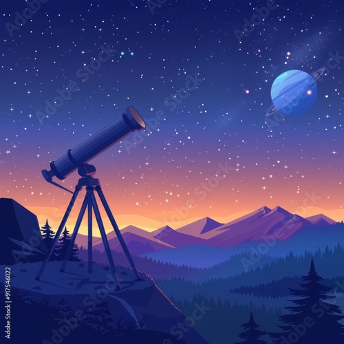 telescope, star, night, sky, astronomy, space, universe, galaxy, planet, observatory, mountain, landscape, nature, forest, tree, dark, blue, purple, pink, orange, horizon, sunset, silhouette, vector, illustration, science, discovery, exploration, cosmos, astronomic, celestial, cosmic, night time, scenery, view, distant