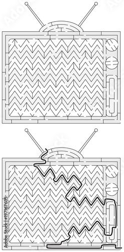 television, signal, screen, cartoon, composition, drawing, easy, education, game, illustration, labyrinth, labyrinth, path, puzzle, solution, activity, task, educational, outlined, black, white