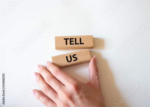 Tell us symbol. Concept words Tell us on wooden blocks. Beautiful white background. Businessman hand. Business and Tell us concept. Copy space.