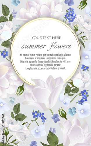 Template for greeting cards, wedding decorations, invitation, sales. Vector banner with Luxurious summer flowers. Spring or summer design. Space for text.