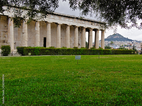 Temple of Hephaestus in Athens, Greece. Grass in the foreground with label "Do not walk on the grass". Lycabettus hill and city building in the background.