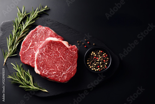 Tempting Steak: Two premium cuts of raw steak, artfully presented with fresh rosemary sprigs and peppercorns, against a rich, dark backdrop.