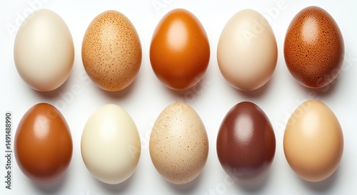 Ten eggs in various shades of brown and beige are arranged in two rows of five on a white background. A beautiful display of natural colors.