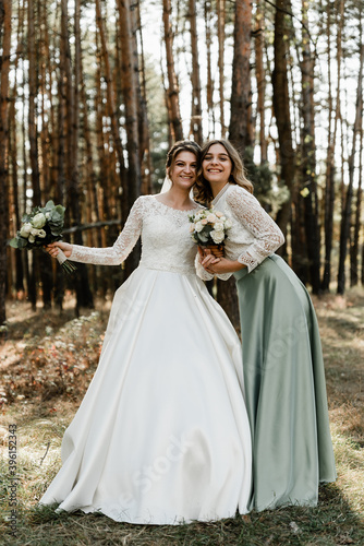 Tender bride with smiling bridesmaids dressed in long elegant dresses,bridesmaids with happy bride on wedding day. wedding bouquets are held by girlfriends, wedding day,