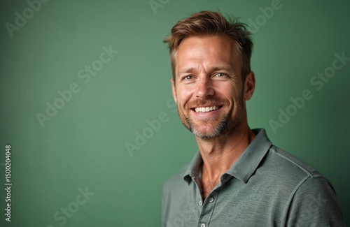 Tender caucasian man in 40s wearing sporty polo shirt smiles. Classic, smart casual preppy attire, comfort wear. Face portrait against soft green backdrop. Represents positive mood, fresh attitude.