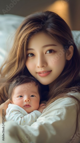 Tender Moment Asian Mother Gently Holding Her Newborn Baby Close