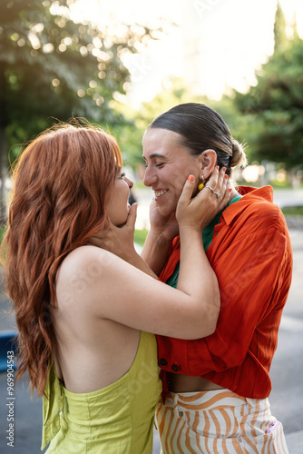 lesbian, couple, love, hugs, sunset, sunlight, joy, happy, woman, affection, tender, moment, summer, evening, human relationships, romantic, girlfriend, emotion, support, connection, bonding, cheerful, smiling, joyous, heartfelt, oneness, togetherness, partnership, diversity, inclusive, affectionate, happiness, casual attire, fashion, style, urban, street, city, park