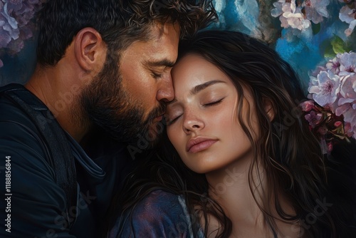 Tender moment of love, man kissing woman’s forehead, her eyes closed in serene peace, intimate connection, soft emotions shared