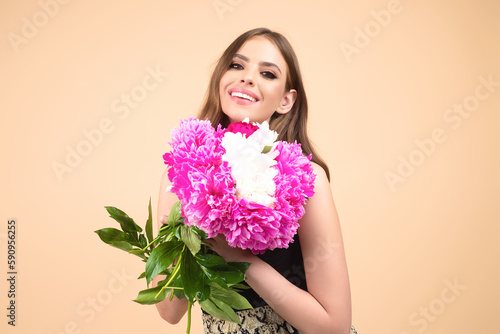 Tenderness and beauty. Beauty girl with spring peonies flowers. Beautiful sensual woman hold bouquet of peonies flowers, studio portrait on beige background.