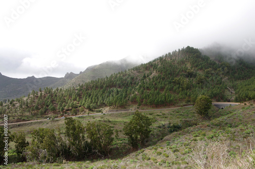 mountain, vale, massif, canary, island, canarian, tenerife, spain, traveling, travel, panorama, panoramic, view, rock, stone, european, europa, tour tourism, nature, natural, landscape, scenery, sky, cloud, rain, rainy, storm, cliff, tree, road, way, winding, highway, serpentine