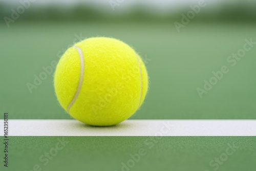 Tennis Ball Close-Up on Court Line: Vibrant Yellow Sport Equipment on Green Surface