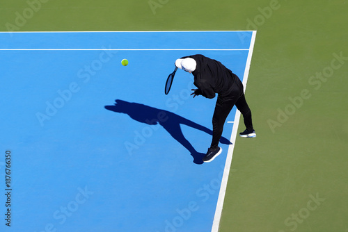 Tennis concept. Aerial view. Minimalist faceless image of a tennis player playing on a blue and green court.