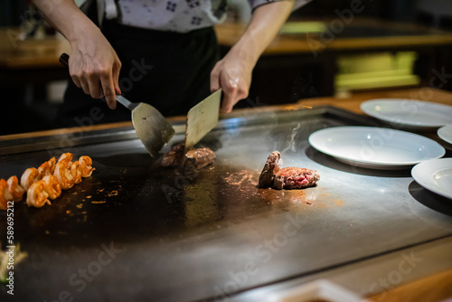 Tepanyaki - japanese grilled beef on pan. chef cooking at the hot table