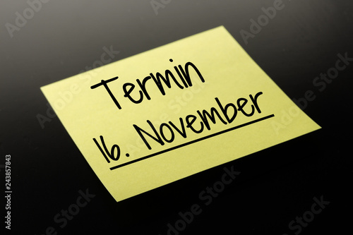 Termin 16. November - gelber Notizzettel dunkler Hintergrund
