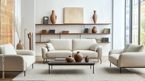 Terra cotta and white armchair near sofa against window and concrete, interior of a modern renovated apartment.